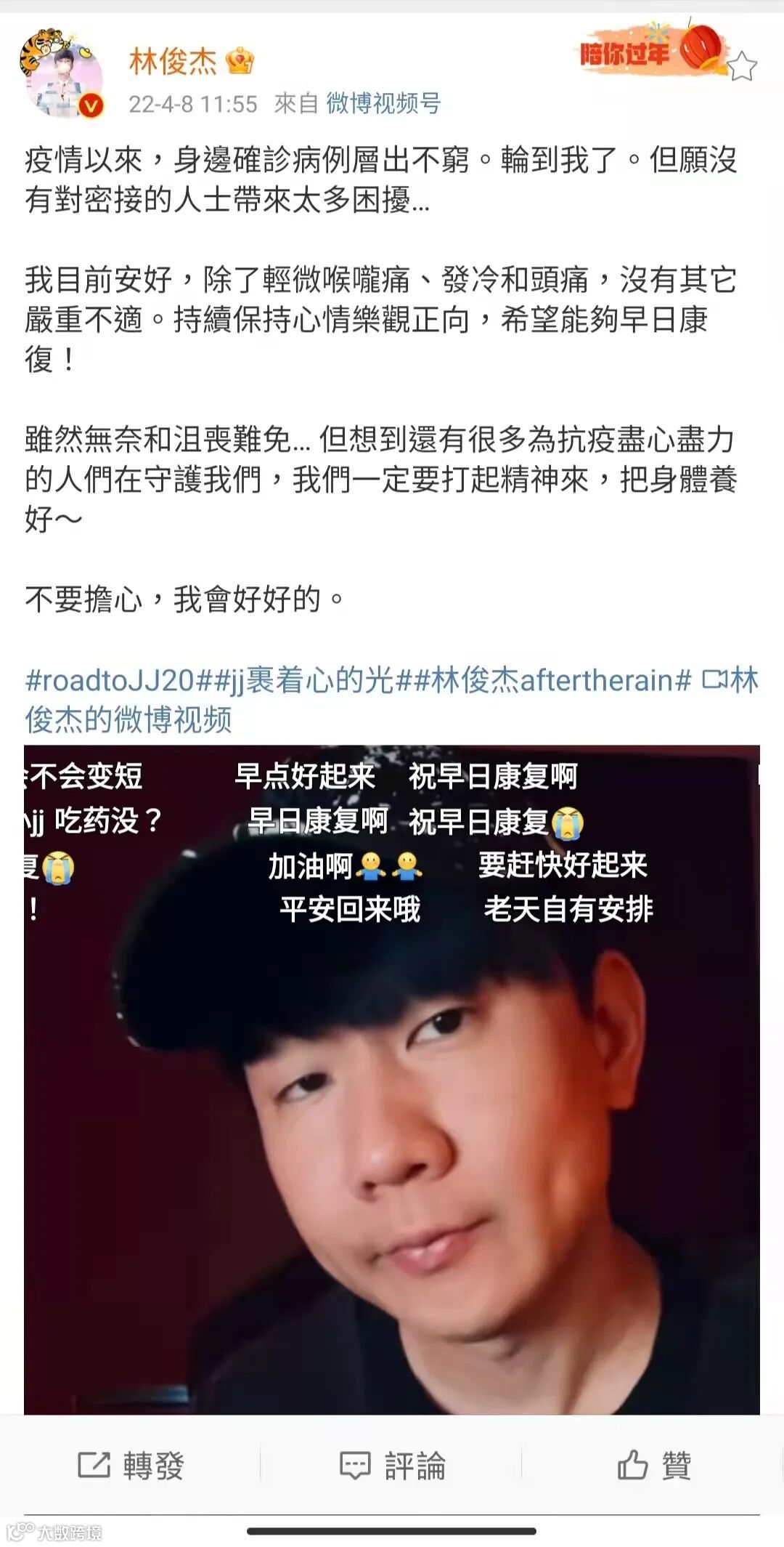4月8日,林俊杰在社交平台宣布,自己确诊得新冠。