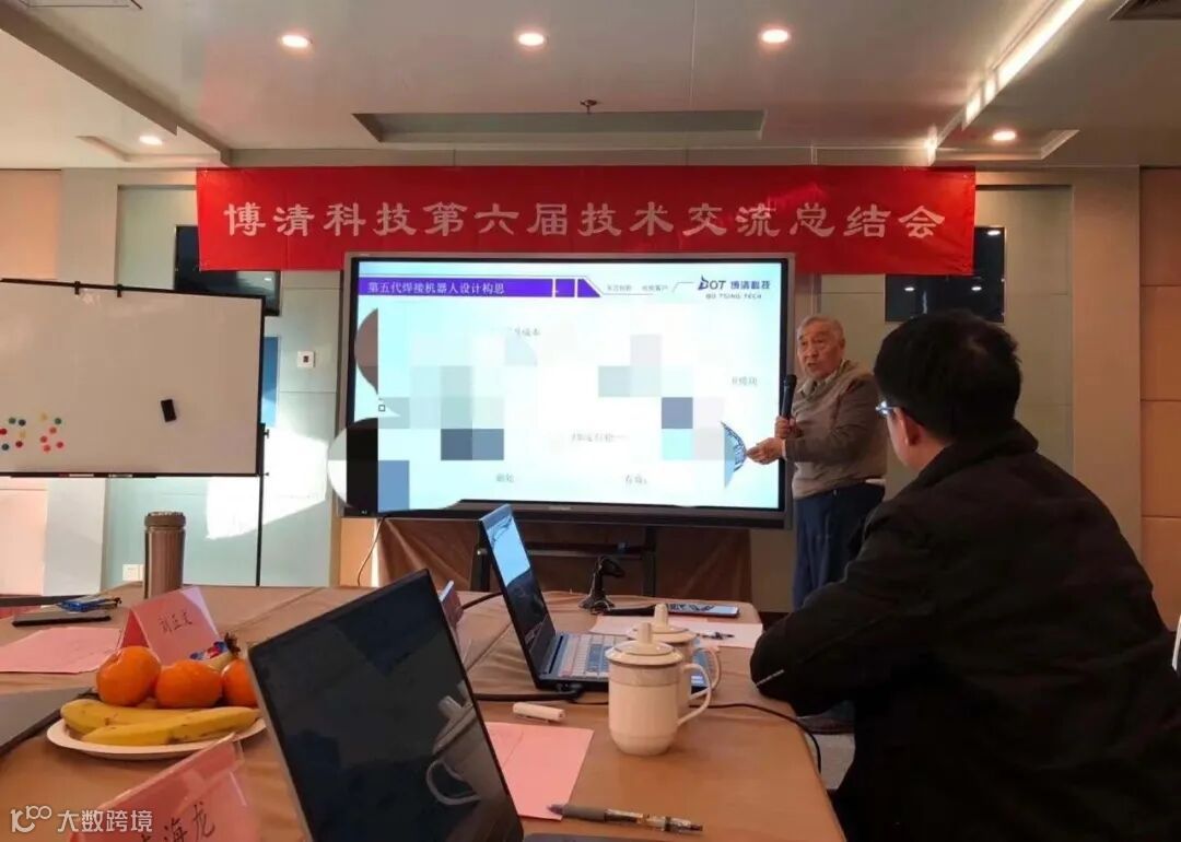 无轨导全位置爬行焊接机器人由潘际銮院士和高力生教授团队研发,由博清科技进行产业化推广的全球首创性产品。二十年磨一剑,博清人来传承。自博清科技成立以来,召开了多次技术交流总结会,高教授每次都莅临指导,即使是炎炎夏日,在车间里一站就是大半天,聚精会神地与博清工程师就产品现状进行沟通,耄耋之年的高教授讨论起技术来状态还似“精神小伙儿”一般,在机械设计、工艺研究等多方面提出了指导意见。