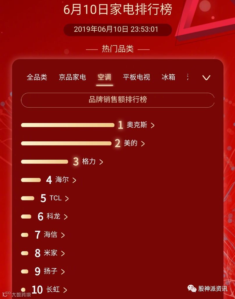 可以看出,奥克斯品牌在互联网渠道上有一定的销售优势。值得一提的是,根据京东6月10日大家电排行榜显示,当天的大家电销量奥克斯超过了美的稳居销量榜第一名,现在格力选择在电商促销的关键时点举报,或对奥克斯空调销售产生一定影响。
