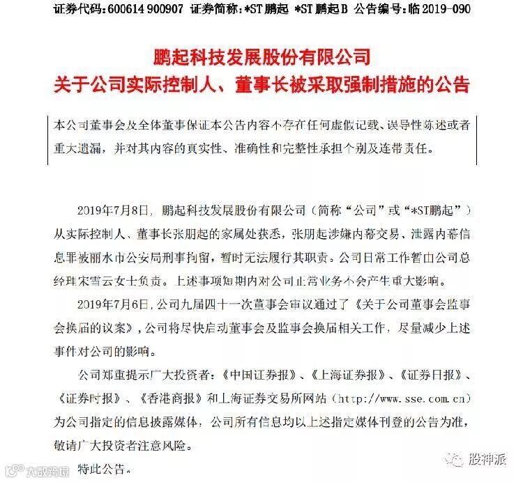7月8日晚间,*ST鹏起(600614.SH)公告爆雷:实际控制人、董事长张朋起被刑拘。