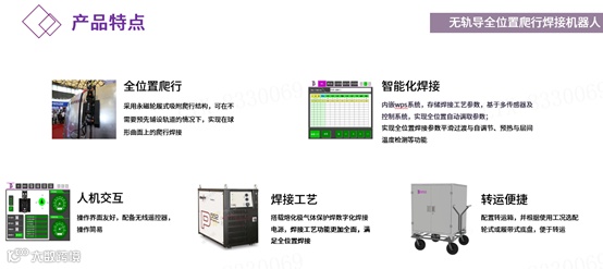 无轨导全位置爬行焊接机器人:公司无轨导全位置爬行焊接机器人是在潘际銮院士二十余年的研究基础上孵化的全球首创性产品,是大型结构件自动化焊接的强大武器,目前已广泛应用于多个领域。
