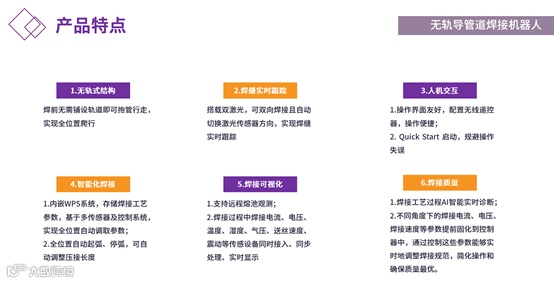 无轨导管道焊接机器人:无轨导管道焊接机器人是针对管道全自动焊接研发的特种机器人,该机器人实现了自动对中焊缝,自动起弧和停弧,实时调整工艺参数,自主调整焊接摆幅等功能,大大降低对于焊接人员的技能依赖。产品特点如下图所示。