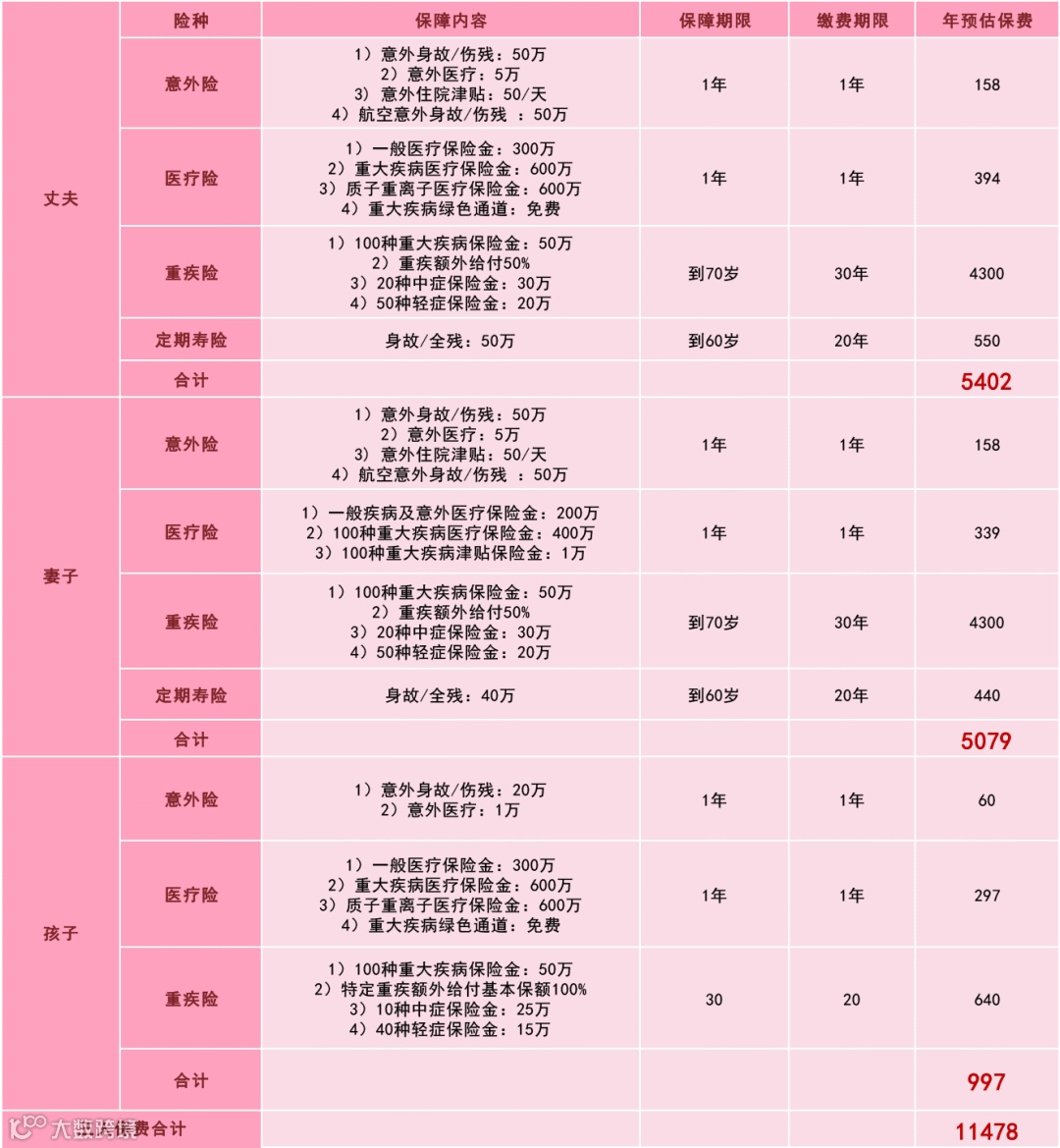 只有先定好顶层规划,以家庭为整体配置保险,才能既全面又不重复,用更少的钱换来更多的保障。