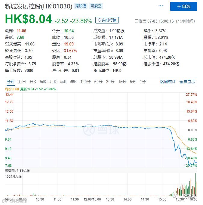 新城发展控股(1030.HK)收跌23.86%,报8.04港元,午后股价跳水最低跌逾27%,股价瞬间暴跌,从10.74港元直线下跌至7.68港元,44分钟下跌27%。临近收盘股价有所回升,股价收报于8港元,跌幅24.15%。