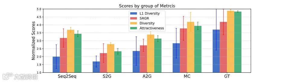 为了验证 SRGR 的有效性,研究者将动作序列被随机切割成 40 秒左右的片段,要求参与者根据动作的正确性,多样性和吸引力对每个片段进行评分。最终共有 160 人参与评分,平均每个人对 15 个随机的手势片段打分。图表显示,与 L1 多样性相比,SRGR 在评估手势多样性方面与人类感官更为相似。