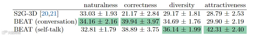 表中显示,BEAT 在各方面的主管评分都很高,表明这个数据集远远优于 Trinity。同时在数据质量上也超过了现有的视频数据集 S2G-3D。