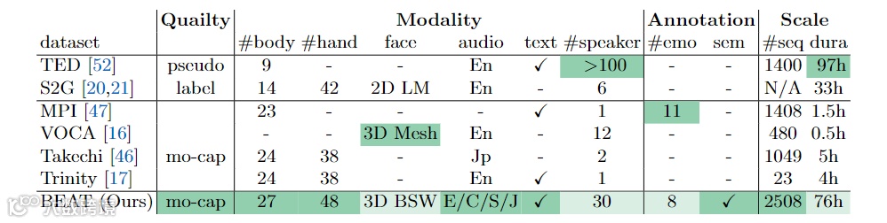 下表还将 BEAT 与现有的数据集进行了比较,绿色高光表示最佳值,可以看出,BEAT 是现阶段包含多模态数据和标注的最大的运动捕捉数据集。