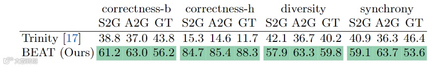 为了评估 BEAT 这一新型数据集的质量,研究者使用了现有研究中广泛使用的动捕数据集 Trinity 作为对比目标。每个数据集被分成 19:2:2 的比例,分别作为训练 / 验证 / 测试数据,并使用现有方法 S2G 和 audio2gestures 进行比较。评估主要针对不同数据集训练结果的正确性(身体动作的准确性)、手部正确性(手部动作的准确性)、多样性(动作的多样性)和同步性(动作和语音的同步性)。结果见下表。