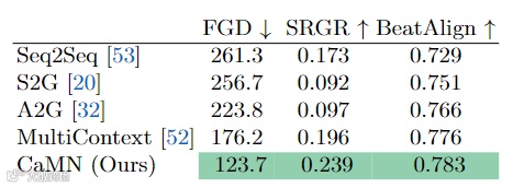 为了评估手势的多样性和与语音的同步性,研究者采用了本文提出的 SRGR 和舞蹈动作生成中常用的指数 BeatAlign。
