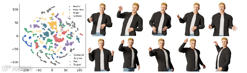 BEAT 数据集要求每个演讲者必须录制 8 种不同情绪下的谈话动作,用于分析动作与情感之间的内在联系。在演讲环节中,自然情绪占比 51%,愤怒、快乐、恐惧、厌恶、悲伤、蔑视和惊讶这七类情绪分别占比 7%。对动作进行聚类的结果证明,动作和情感之间存在相关性,如下图所示。