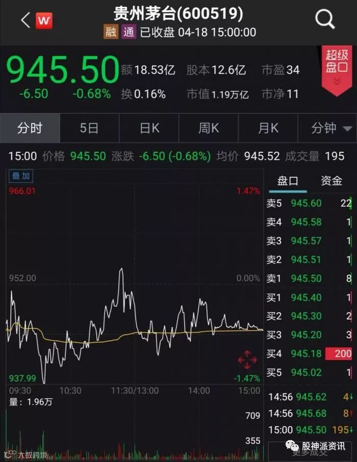 4月18日,贵州茅台微跌0.68%,从952元跌落到945.5元。