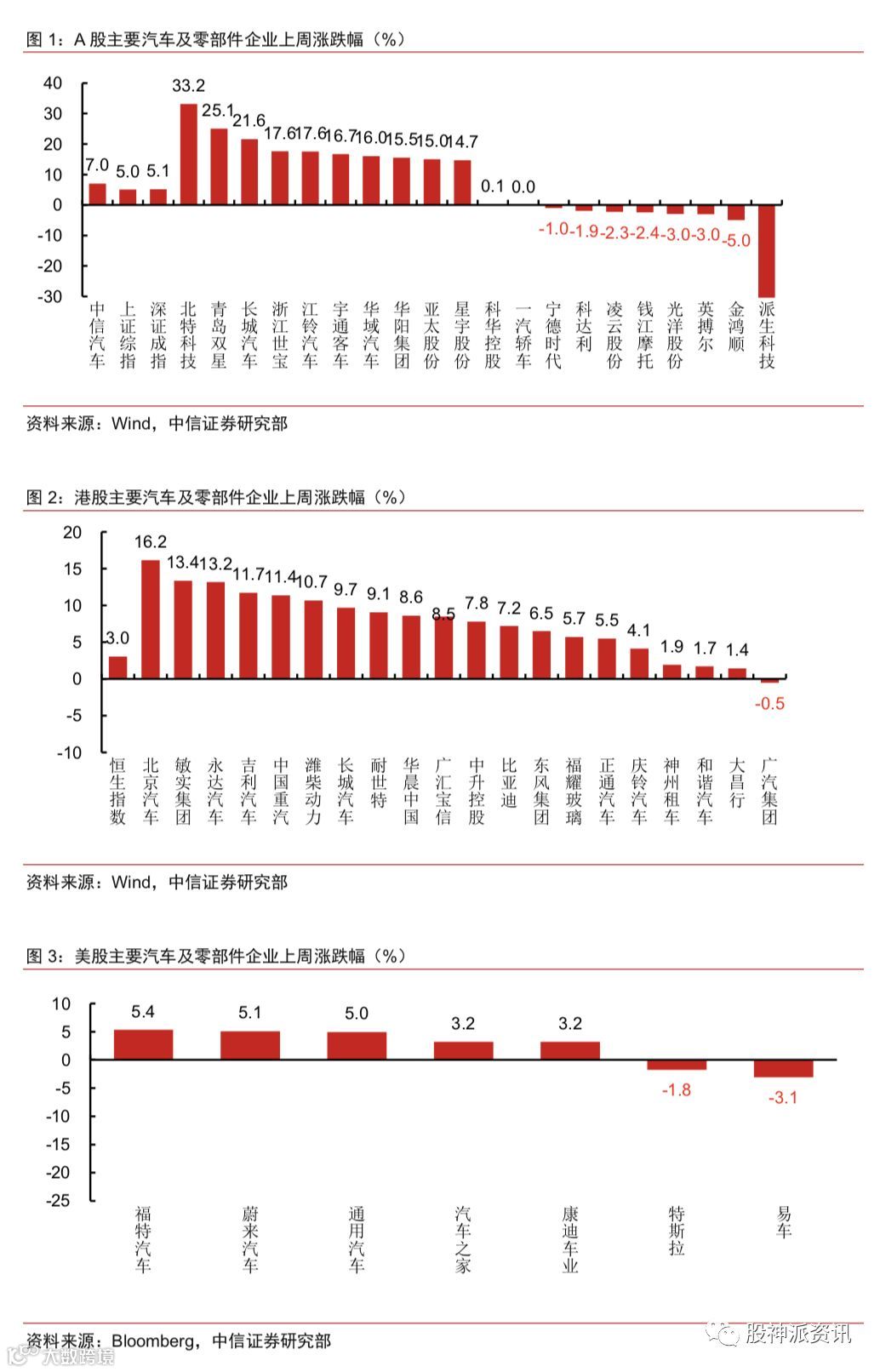 上周中信汽车指数+7.04%,强于上证综指(+5.04%),强于深证成指 (+5.14%)。涨幅居前的为北特科技(+33.16%)、青岛双星(+25.05%)、 长城汽车(+21.58%);跌幅居前的为派生科技(-34.38%)、金鸿顺(-5.00%)、 英搏尔(-3.03%)。