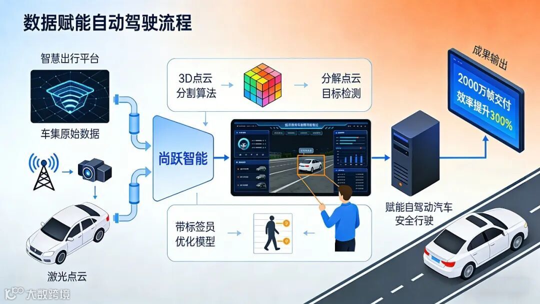 在AI Infra的实际落地中,尚跃智能已成为海内外30余家头部主机厂、智驾车企的核心数据伙伴,并间接服务全球头部芯片制造商 —— 以某头部自动驾驶企业项目为例:我们深度嵌入其研发闭环,承接整车原始传感器数据,通过3D点云分割、多目标精准检测等全栈标注能力,累计交付超 2000万帧高精度标注数据;不仅将该项目自动泊车场景的标注效率提升 300%,更帮助客户将对应的模型训练周期缩短35%,同时支撑其核心场景的模型识别准确率提升至98.7%,交付价值与服务能力稳居行业第一梯队。