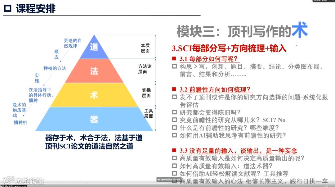 “道法术器”这四个字,或许听起来有些抽象,但在慢老师的讲解下,它却成为了科研工作中极具实用性的模型。从宏观的科研理念(道),到具体的研究方法(法),再到实际的操作技巧(术),以及最终呈现的成果(器),这一模型贯穿了科研的全过程。慢老师结合个人思考,为我们展示了如何运用这一模型来理解 SCI 的多维度内容,并提出了SCI论文的写作模型,详细介绍了如何利用AI来探寻科学问题、预实验、框架搭建等步骤。