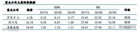 此次行动计划的出台,对超高清成像、超高速存储、视频 人脸识别、SoC核心芯片、存储芯片、新型显示器件等领域将带来新 一轮发展机会,相关芯片、面板、摄像头及新型器件等产业链将充分 受益于高清视频产业的发展,建议关注京东方、深天马、海康威视等 重点标的。
