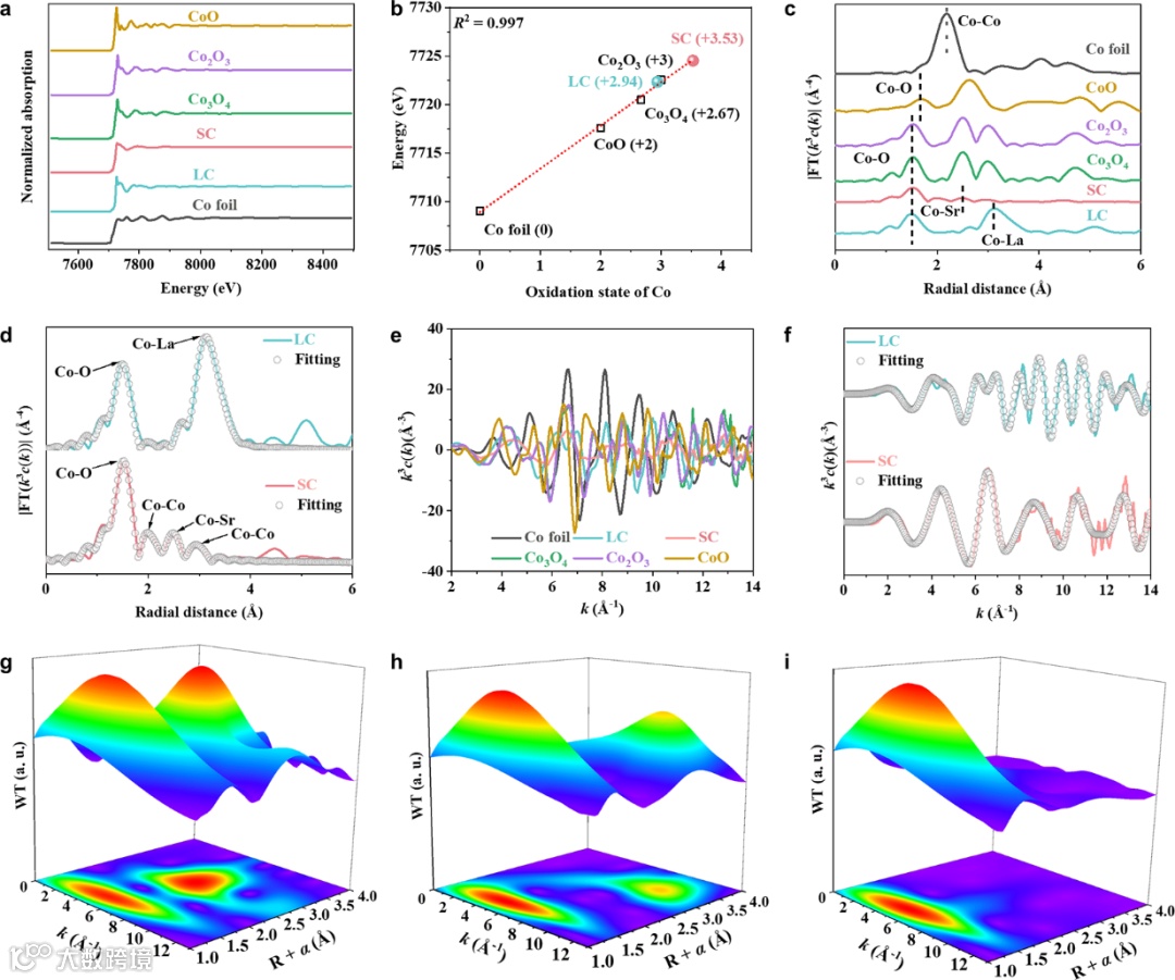 图4:为LC和SC为基于同步辐射的X射线吸收谱。通过归一化的Co K边XANES光谱及氧化态计算,准确得出LC和SC中Co的氧化态分别为+2.94 和+3.53。FT-EXAFS光谱在R空间和k空间的分析,揭示了Co的局部配位环境,包括Co-O、Co-La、Co-Sr 键的特征以及配位数的差异。这些结果充分表明,A位金属元素的替代对Co的配位环境产生了显著影响,而这种配位环境的变化与催化剂性能之间存在着紧密的联系。