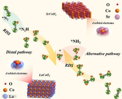 1)研究提出通过调节钙钛矿中金属钴的自旋态,利用“给体-反馈给体”机制调控eNRR路径,提升钴基钙钛矿性能的新策略。