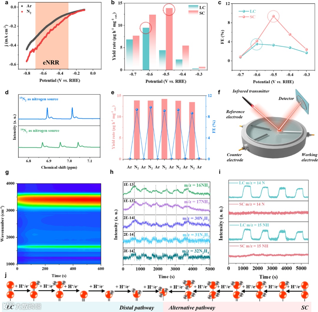 图3:氨产率和FE随电位变化呈现出“火山图”趋势,其中SC在-0.5 V时展现出远超LC的优异性能。ATR – SEIRAS和DEMS分别从光谱和质谱的角度,直观地展示了反应过程中物质的变化情况以及反应途径,为理论预测的反应路径差异提供了有力的实验验证。