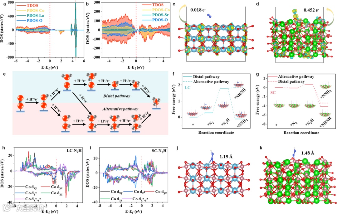 图1:从态密度(DOS)角度分析,SC带隙减小,为电子转移创造了更有利的条件,同时其Co的d轨道对称性变化揭示了自旋态由高到低的转变。电荷差分密度图清晰呈现出SC向N2的电荷转移更为显著,充分表明其对N2的活化能力更强。通过对反应途径吉布斯自由能的计算,明确了LC倾向于远端反应途径,而SC更倾向于交替途径。在吸附∗N2H的状态下,二者轨道分布差异明显,LC的dxy和dyz轨道利于电子转移,SC的dz2轨道借助“给予-反馈给予”机制有效活化∗N2H,这些差异从本质上影响了eNRR的反应路径与效率。