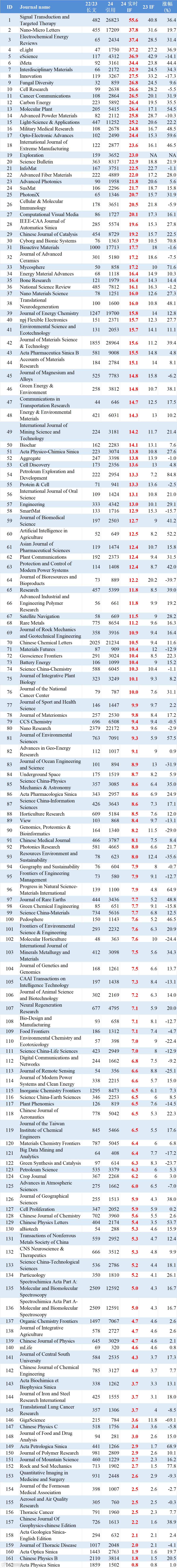 经过Web of Science 官网对引用前100和IF排名前100的中国(包括香港、澳门和台湾)期刊以及中国主办或中国人主编的高影响力期刊进行了2024年影响因子计算。结果显示,162本中国期刊有27本突破20分;其中,Signal Transduction and Targeted Therapy影响因子排名第一,预估55.6,将创造历史,成为中国乃至亚洲首本破50的期刊,同时有望超越CNS的影响因子,其次是Nano-Micro Letters和Electrochemical Energy Reviews分别为37.8和37.4。2024年实时影响因子平均IF增长了14%,共有117本增长,44本下降。