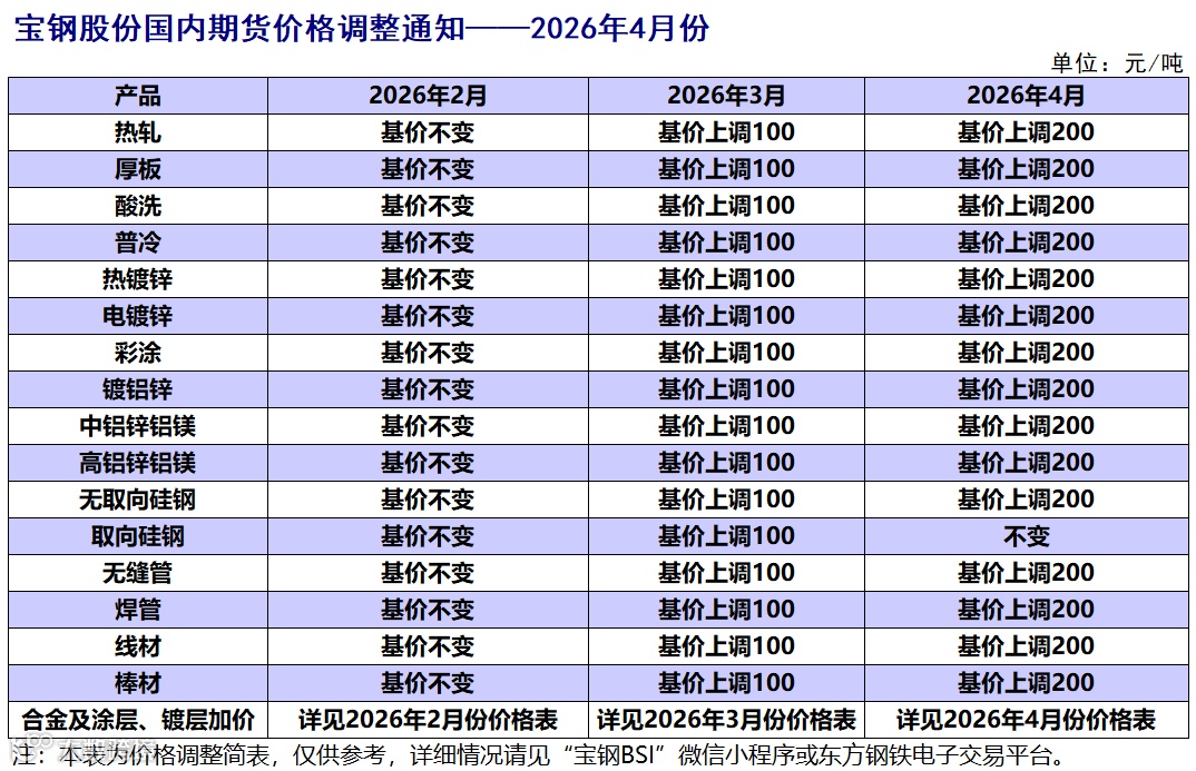 宝钢股份内销价格2026年4月份在2026年3月份基础上调整公告如下