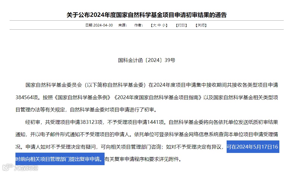 关于公布2024年度国家自然科学基金项目申请初审结果的通告