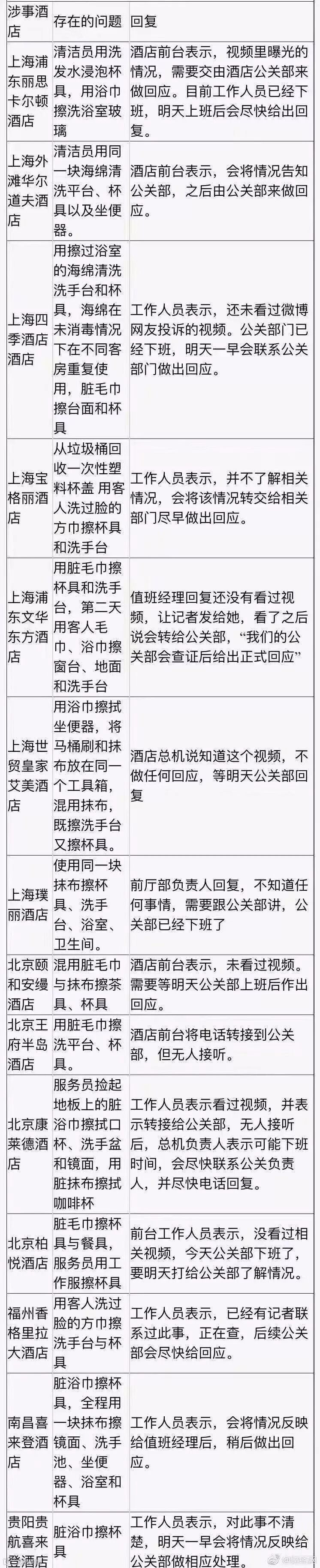 记者昨日晚间晚间联系了部分涉事酒店,除福州香格里拉大酒店工作人员表示正在查,后续公关部会尽快给出回应外。大多数酒店员工都表示,公关部已经下班,明天由公关部做出回复。