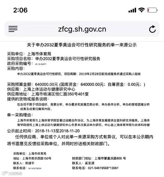 据第一财经日报等媒体爆料,目前上海拟花64万元,做申办2032夏季奥运会可行性研究。公示文件显示,上海市体育局正对申办2032夏季奥运会进行可行性研究分析的招标。上海已举办过多项国际知名赛事,包括网球上海大师赛、F1上海站、NBA中国赛、国际田联钻石联赛。