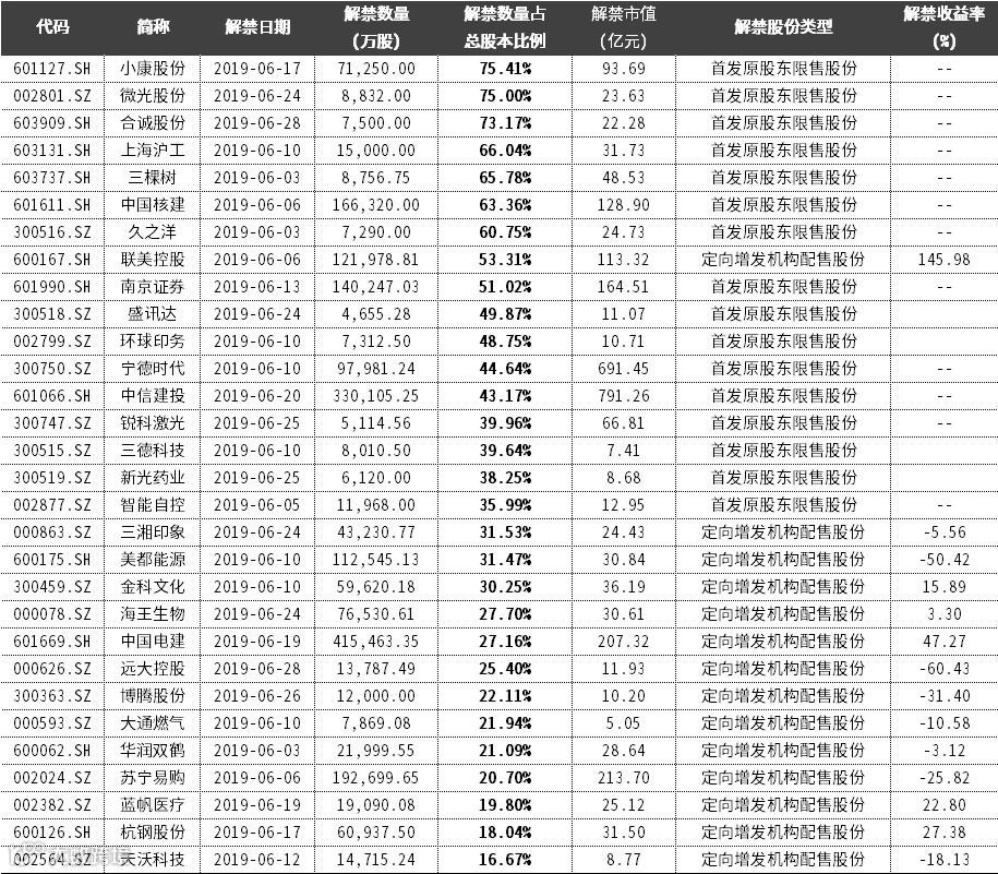 6月,全市场共有101家上市公司涉及限售股解禁,解禁市值约3300亿元,基本与上月持平。从个股来看,6月份新增解禁数量占总股本比例超50%的个股有9只,需要留意一下。