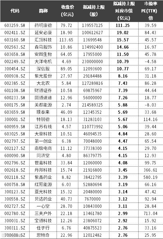 剔除已完成减持的4家公司后,我们整理了剩余公司的重要股东计划减持计划,其中合计减持市值前三十高的个股如下表所示,大家不妨跟踪关注。
