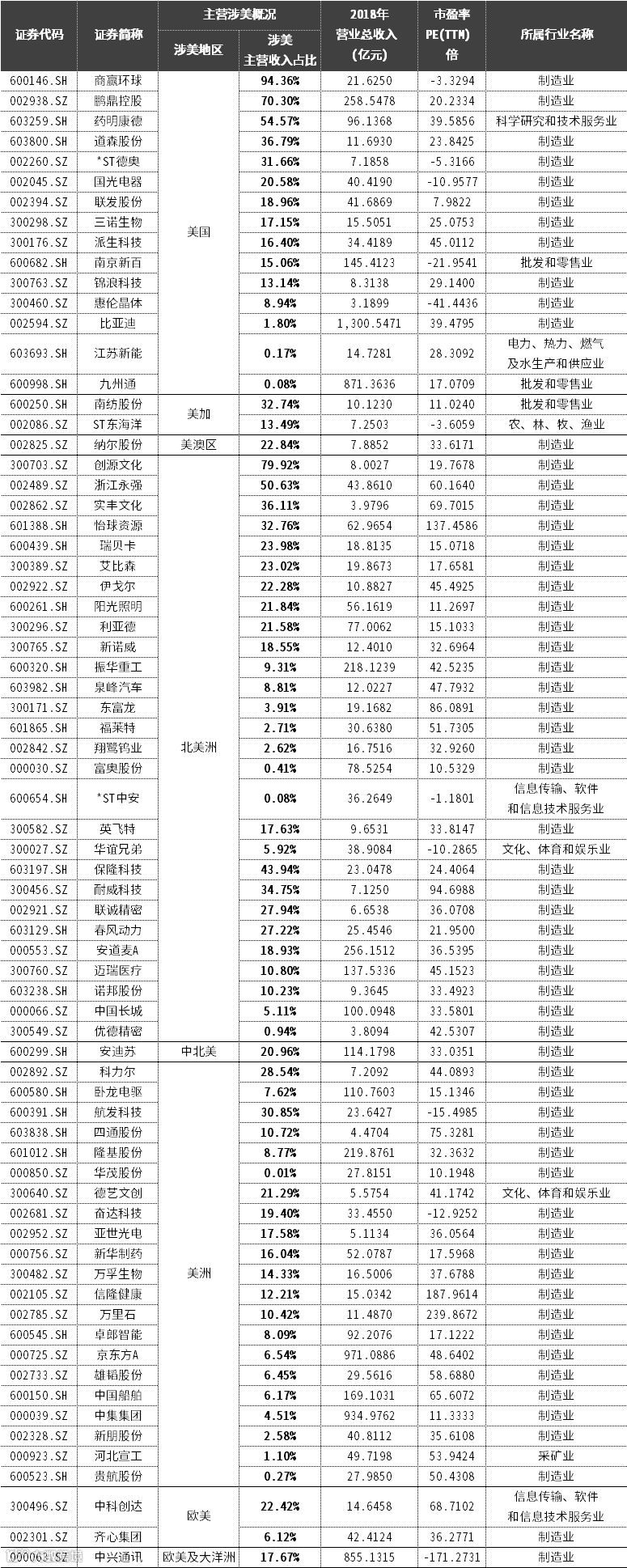 我们通过梳理A股上市公司2018年年报发现,有72家明确披露涉美地区的主营收入占比,具体如下表所示,供大家投资参考。