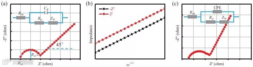 图5 (a)Randles电路模型(蓝色)及其对应的电化学阻抗图谱(红色)(b)Zre(实部)或Zim(虚部)与ω-1/2(ω为角频率)之间的线性关系 (c)偏离的Randles电路模型(蓝色)及其对应的电化学阻抗图谱(红色)