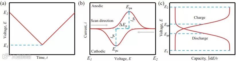 图1(a)循环伏安测试的电压曲线(b)电流响应与电压曲线(c)电压与积分电流曲线