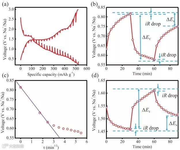 图4 (a)恒电流间歇滴定曲线 (b)在特定静止-放电-静止阶段的电压 vs 时间关系图(c)电压 vs τ1/2关系图,τ为放电时间(d)在特定静止-充电-静止阶段的电压 vs 时间关系图