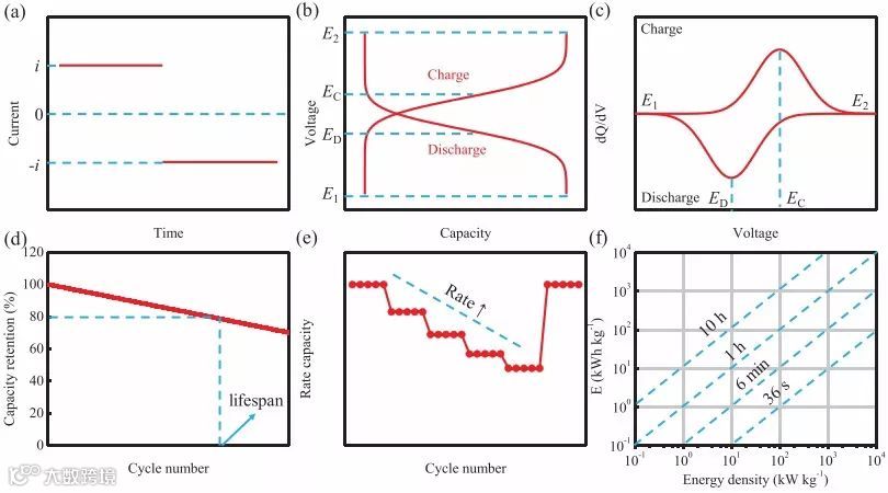 (2)介绍了常见的电极材料评判指标:能量/功率密度、库伦效率和循环寿命;