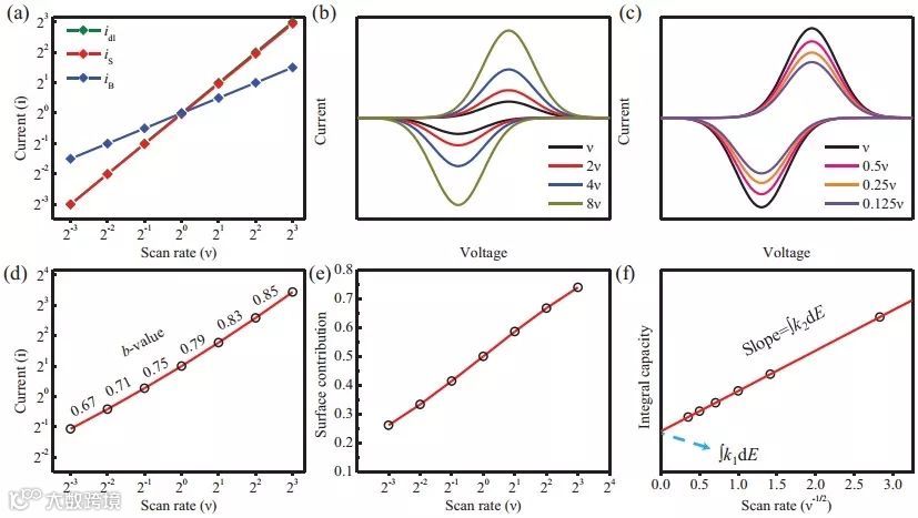 图2(a)三种电流响应模式 (b)、(c)不同扫速下的循环伏安测试曲线 (d)log2(ip) vs log2(v)曲线(e)赝电容贡献(f)积分容量的线性拟合 vs 扫速的平方根的倒数