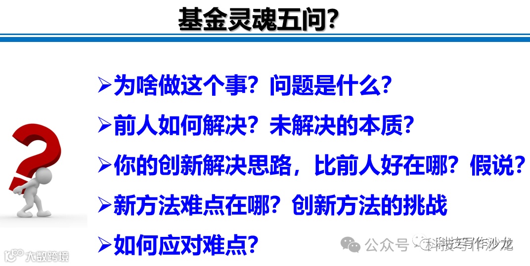大部分申请人对灵魂五问基本的科学逻辑和科学问题不够清楚。为了让这五个问题更加清晰得呈现,小沙建议可以搭配上五张图,这五个图就是灵魂五问的结论(可以是自己的,也可以是引用文献的,也可以自己画的一些卡通图,要动态的,还有箭头)