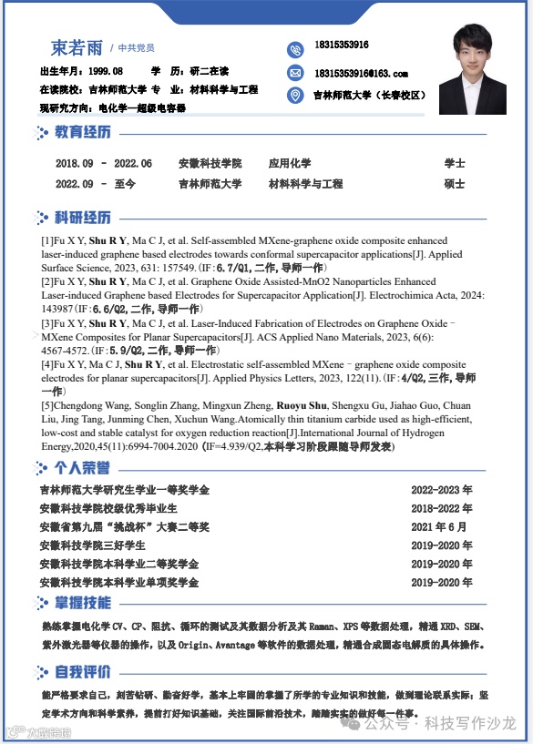 优势:熟练掌握电化学CV、CP、阻抗、循环的测试及其数据分析及其Raman、XPS等数据处理,精通XRD、SEM、紫外激光器等仪器的操作,以及Origin、Avantage等软件的数据处理,精通合成固态电解质的具体操作。