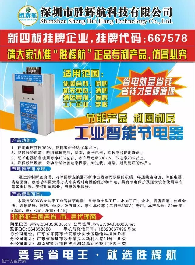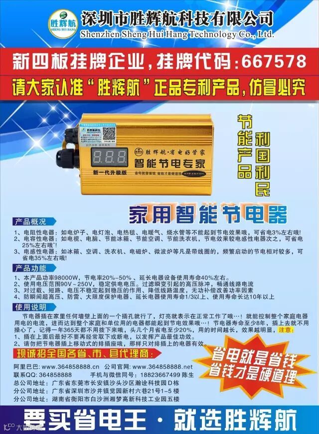 胜辉航公司是国内首家在前海挂牌上市的一家高科技企业,专注研发生产节能产品长达10年以上,拥有自主研发核心技术,非一般山寨、小作坊公司所能模仿。