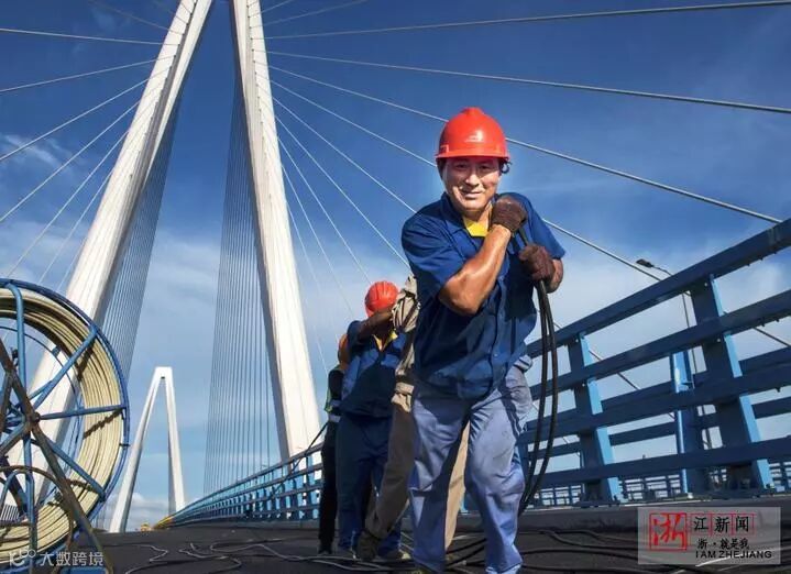 7月14日,乐清湾大桥2号桥施工工地上,建设者们在烈日下安装大桥线路设施。浙江新闻拍友 段俊利 陈盆峰 摄