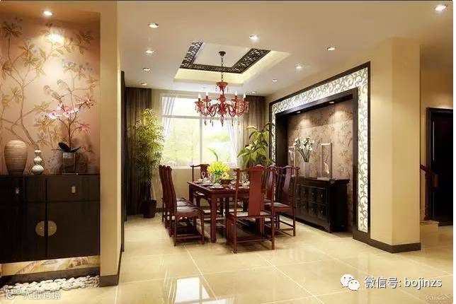 大户型的餐厅大可想图中的餐厅这样装饰,莲花吊灯以及国花挂画都可以让中式餐厅别有一番雅韵。