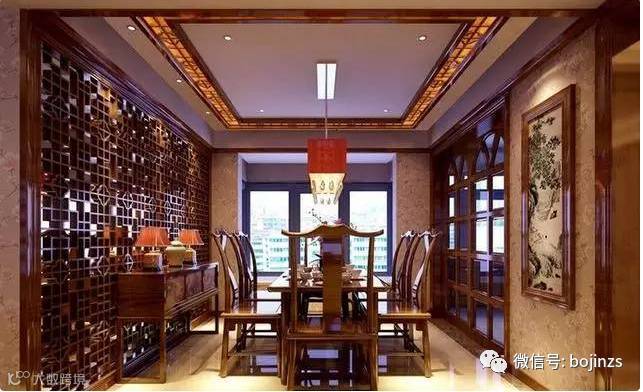 中式风格餐厅最大的特色就是选用木色比较沉稳的木材来装饰,回纹挂画及门窗设计能给中式餐厅增添不一样气质感。