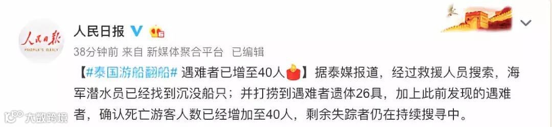 据@人民日报 最新消息,经救援人员搜索,海军潜水员已经找到沉没船只;并打捞到遇难者遗体26具,加上此前发现的遇难者,确认死亡游客人数已经增加至40人,剩余失踪者仍在持续搜寻中。