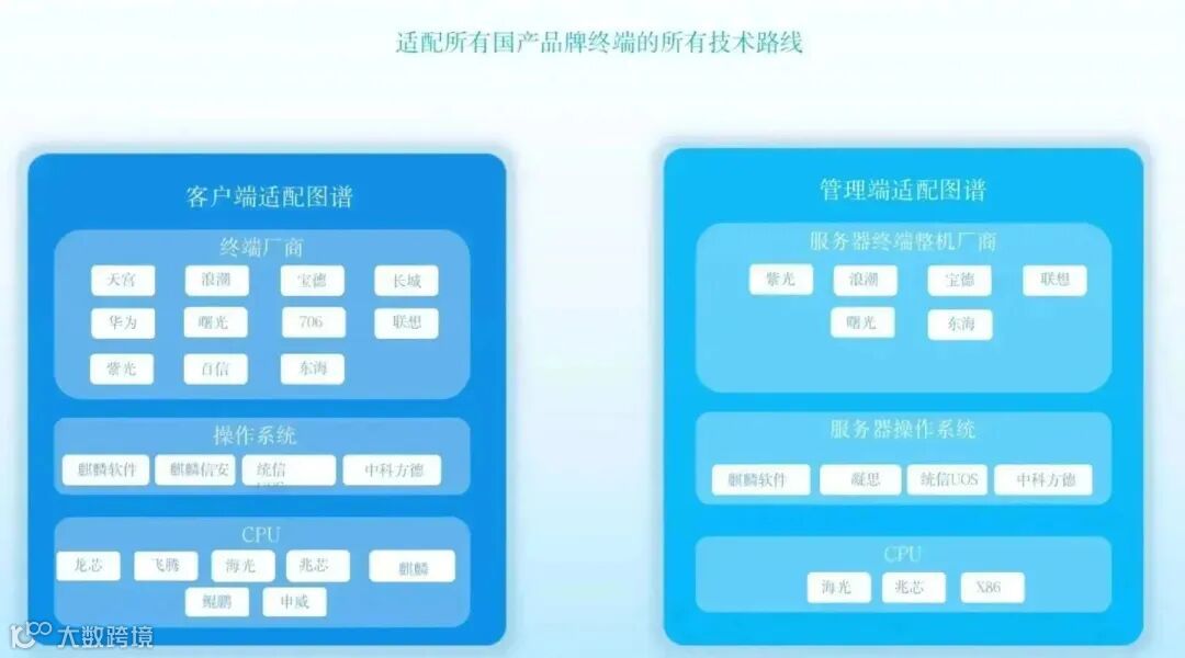 兼容所有国产技术路线,彻底消除因为潜在的技术路线的变化 而导致应用系统及外设适配失效的风险。