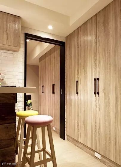 ▲ 一打开门就像进入到森林中一样,木头元素充满了整个屋子。由于房子很小,没有设置专门的玄关,而是设计了摆台和高脚凳,在视觉上就像是一个小巧的玄关,不会让人一进门就将客厅一览无遗,很好的保存了视觉上的隐私性。这样质朴简洁的一室一厅,当然是单身族的最爱,如果是新婚夫妇的话,也是可以勉强住下的。