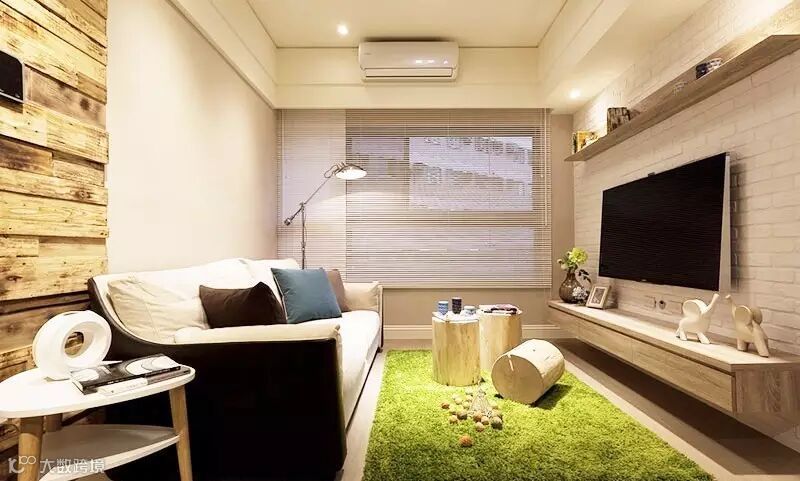 ▲ 沙发背后,片段式的木头背景墙,仿佛回归到了森林之中。沙发前,三个木桩,既可以当凳子,又可以当茶几,还能当装饰品,这个想法太棒了,一物三用!绿色的地毯,就像在家中铺了一块草坪,搭配着木桩,仿佛置身于森林中,充满了生机。房君都要忍不住在上面打滚了~