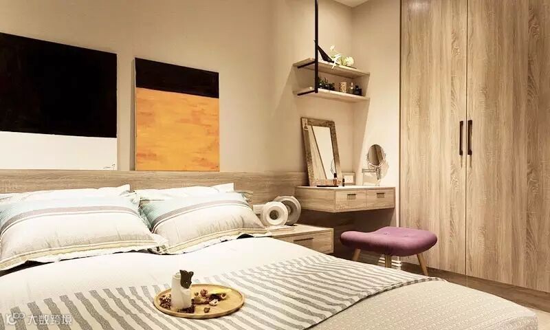 ▲ 梳妆台上的壁挂搁板精致典雅,放几个小物件就能点缀出美妙的室内环境。卧室内同样设置了大衣柜,让储存空间再升级。