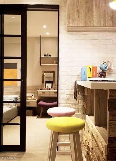 ▲ 吧台旁边就是卧室,用玻璃门隔开,既通透又划分了功能间,小户型就是要用这样的方式让房间变大。