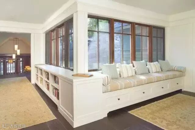 走廊里什么都没有,自己从那儿穿过都觉得冷冷清清的,试想下如果变身成一个休闲娱乐区是不是很棒呢。面积大的可以摆放一个舒适的单人小沙发、一张个性可爱的小桌子,旁边再配上一个小小的高高的花架或者是收纳架,啊,光是幻想着就觉得美美哒。如果面积不够的话,就干脆打造成飘窗,席地而坐也很惬意。