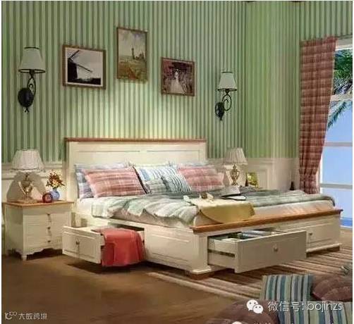 ▲绿色的地中海风格带来明亮之感,但是收纳是整个卧室的亮处,不仅床头有两个小收纳柜,同样的整个床的下方也做了抽屉收纳的设计,而白色与绿色的设计让整个房间有着春天般的明艳。